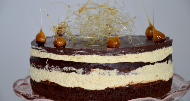 Kao zadnji sloj nanosim ganache kremu. Prilikom nanošenja ganache kreme bitno je da bude nanesena što ravnomjernije. Stavite u hladnjak da se ohladi na nekoliko sati, najbolje da odstoji preko noći. Ukrasite po želji. Ja sam je ukrasila karameliziranim lješnjacima i ukrasima od karamele.