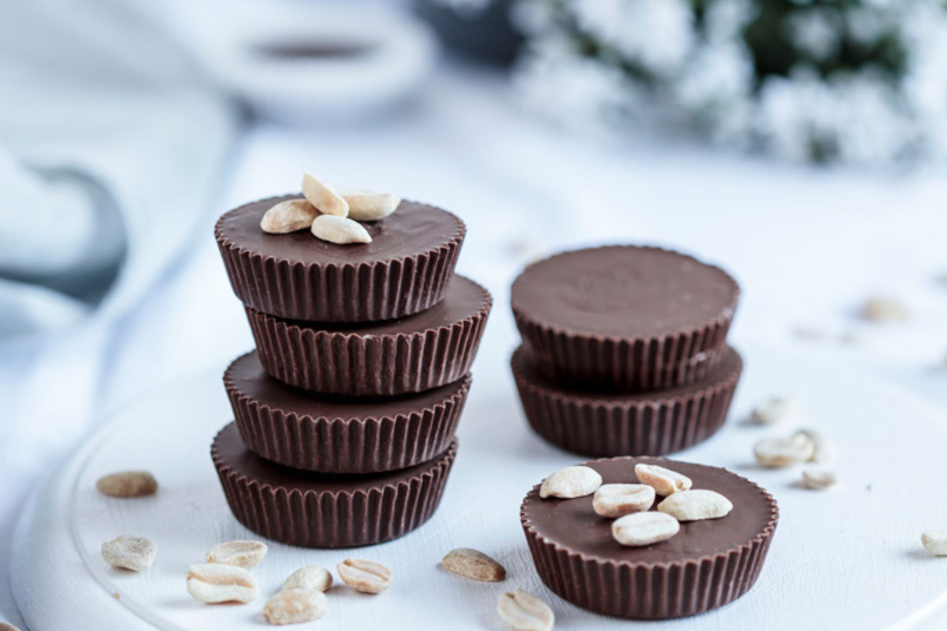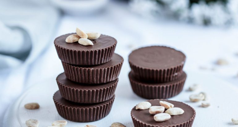 U kalup za muffine stavite papirnate košarice (12 komada). Čokoladu narežite i otopite na pari. U svaku košaricu stavite po jednu žlicu otopljene čokolade i protresite kalup tako da se čokolada izravna. Kalup stavite u hladnjak na 15 minuta. Za kikiriki maslac kikiriki stavite u multipraktik i meljite dok se ne pretvori u maslac bez grudica. Povremeno kikiriki skinite sa stjenki posude.