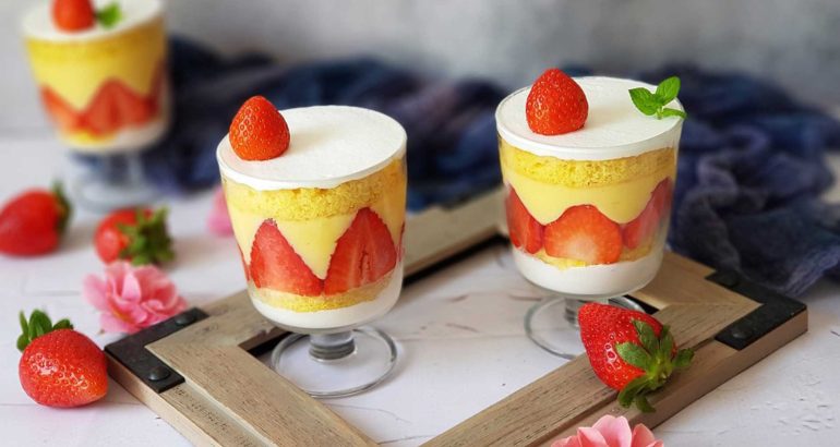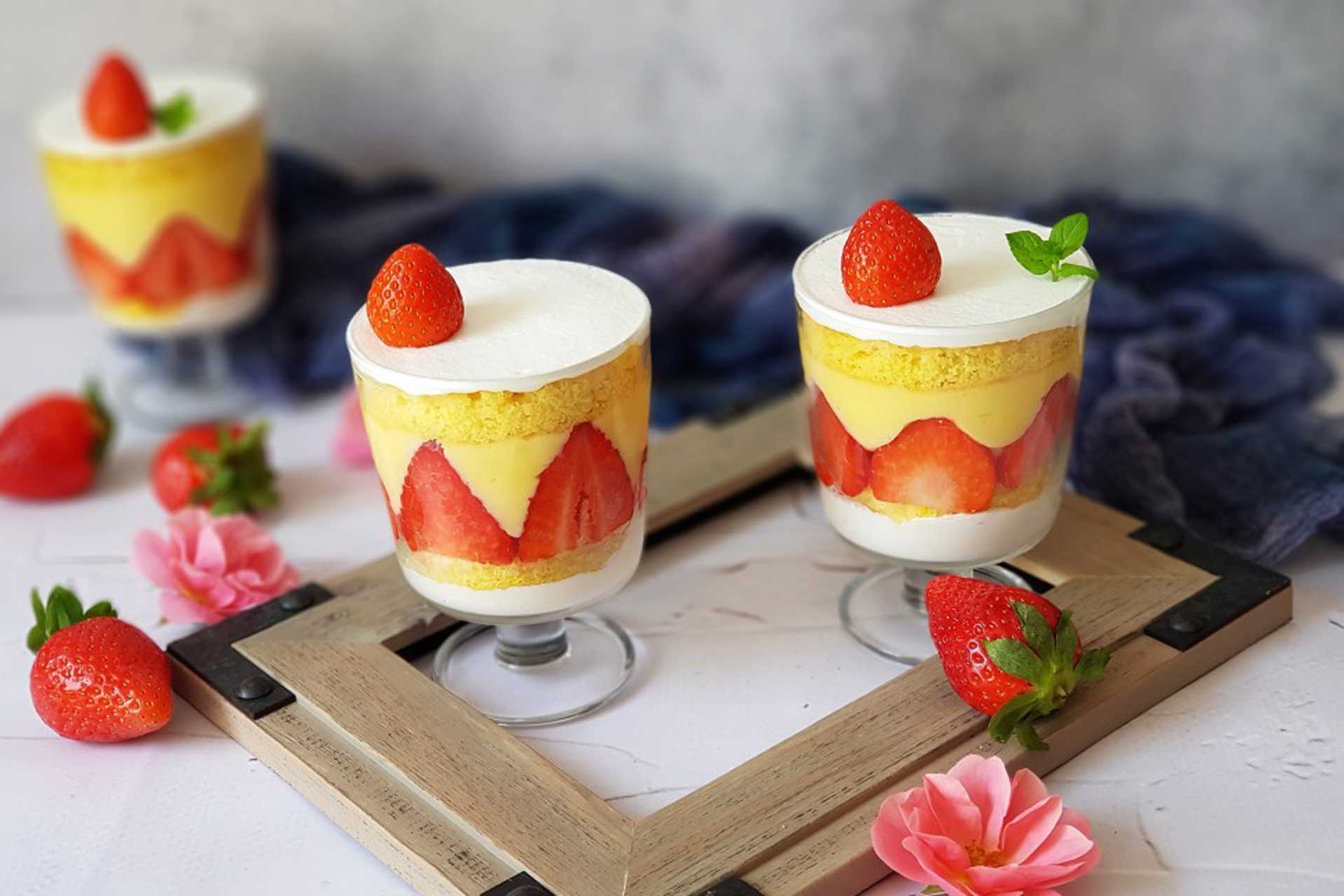 Uz rub čaše rasporedite narezane jagode te čašu ispunite kremom od vanilije.