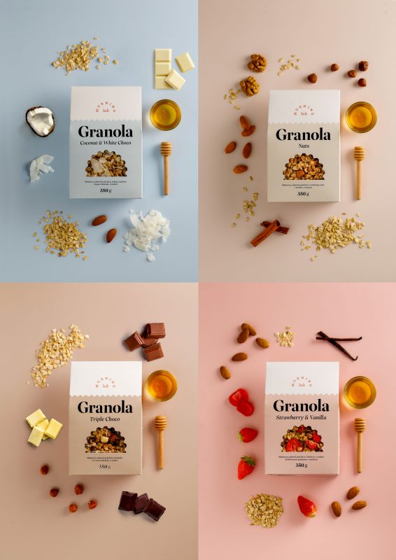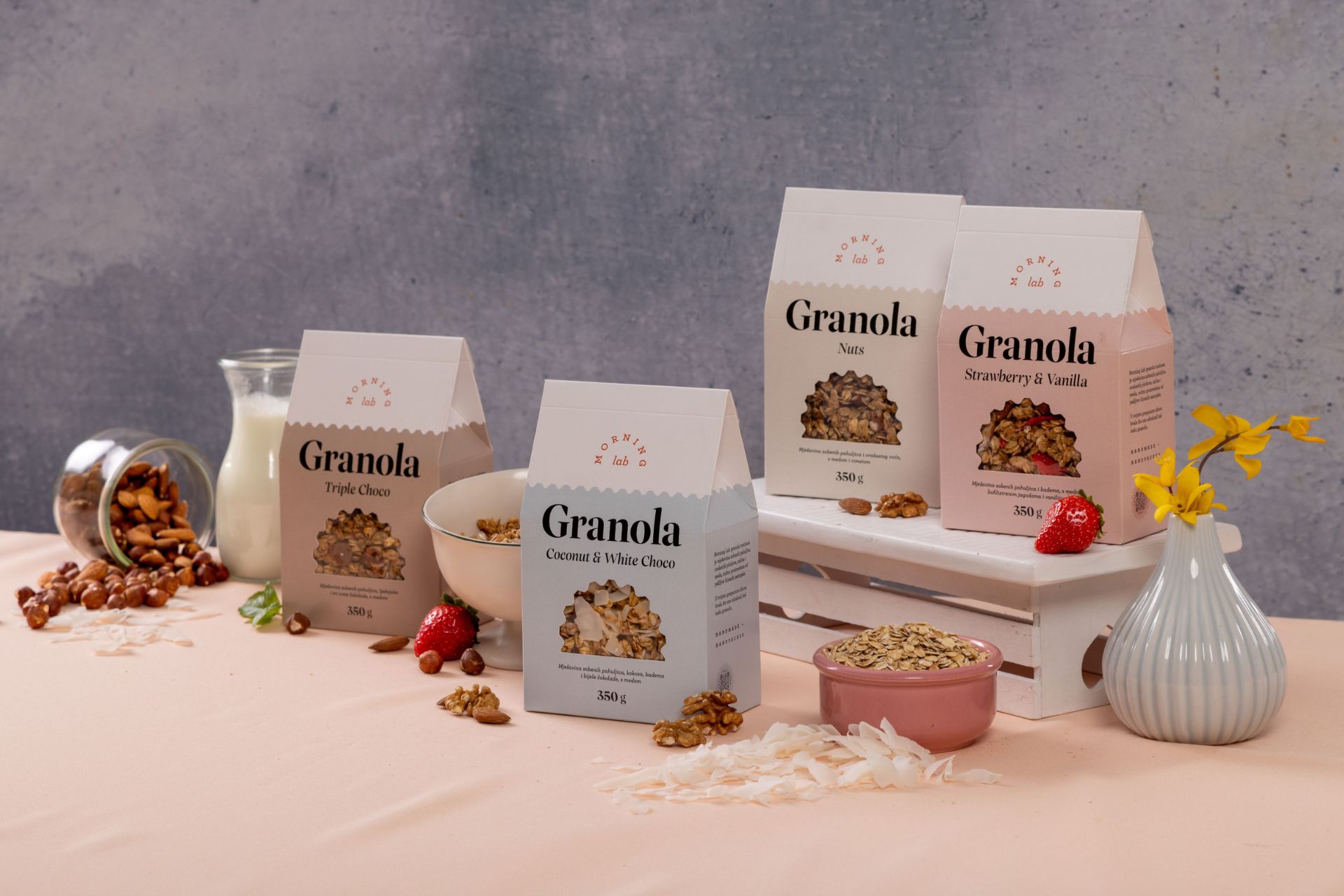 Morning Lab granola dostupna je u nekoliko varijanti i to: GRANOLA NUTS – mješavina zobenih pahuljica i orašastog voća s medom i cimetom, GRANOLA VANILLA/STRAWBERRY – mješavina zobenih pahuljica i badema, s medom, liofiliziranim jagodama i vanilijom te GRANOLA COCONUT/WHITE CHOCO – mješavina zobenih pahuljica, kokosa, badema, bijele čokolade s medom, a pakirane su u pakiranjima od 1 kg.