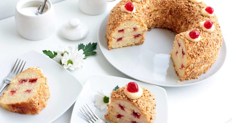 Tako ponoviti i s drugom korom. Na kraju staviti i treću koru te cijeli vijenac premazati ostatkom kreme, posuti krokantom, istisnuti od kreme puslice te na svaku puslicu staviti jednu kandiranu višnju.