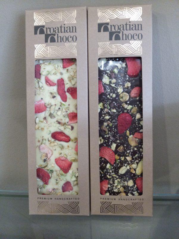 U kombinaciji s mliječnom čokoladom tako dolaze bučine sjemenke, suhe šljive i cimet te lješnjaci, karamel i cvijet soli. Tamna čokolada obogaćena je sljedećim okusima: maslinovim uljem i chilijem; marelicom i citrusima; tartufima, cocoa nibsom i istarskim šafranom; malinama i istarskim šafranom; jagodom, pistacijom i paprom te višnjom i paprom. Bijelu čokoladu naći ćete u kombinaciji sa smokvom i narančom te tartufima, cocoa nibsom i istarskim šafranom, dok ruby dolazi u kombinaciji sljedećih okusa: bademi i brusnica te wasabi i chia sjemenke.