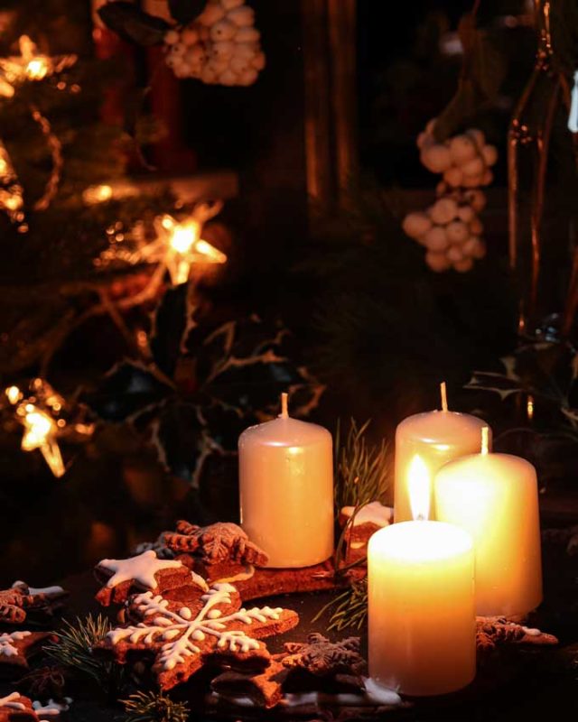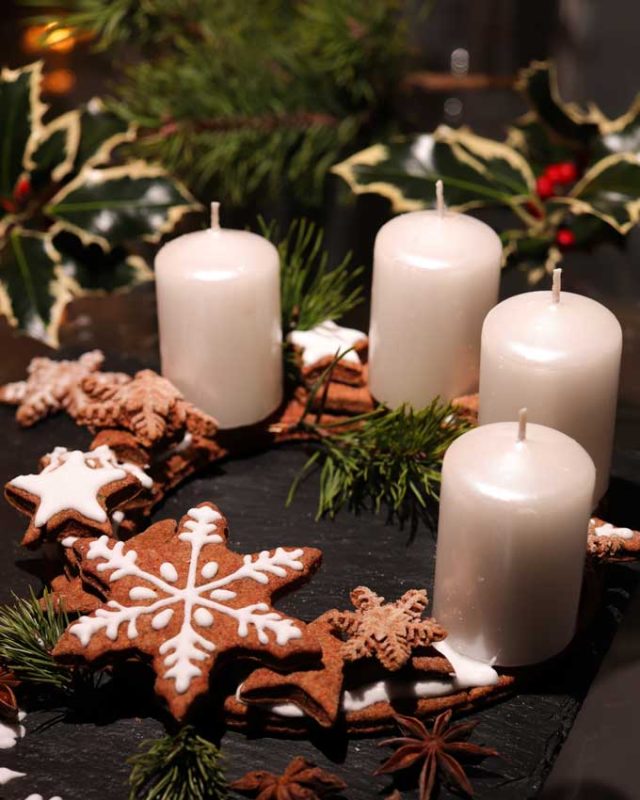 Ohlađene kekse ukrasiti glazurom od šećera i bjelanjka. Kada se glazura posuši slagati na kružnicu i lijepiti glazurom. Po želji ukomponirati u vijenac i svijeće.