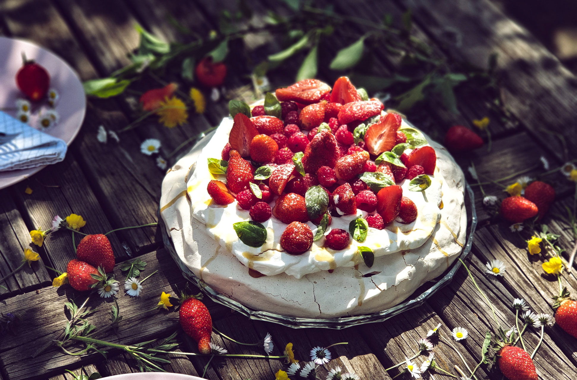 Na vrh meringe stavite kremu od bosiljka, prekrijte ostatkom šlaga, voćem i bosiljkom i prelijte s malo javorovog sirupa ili meda.
