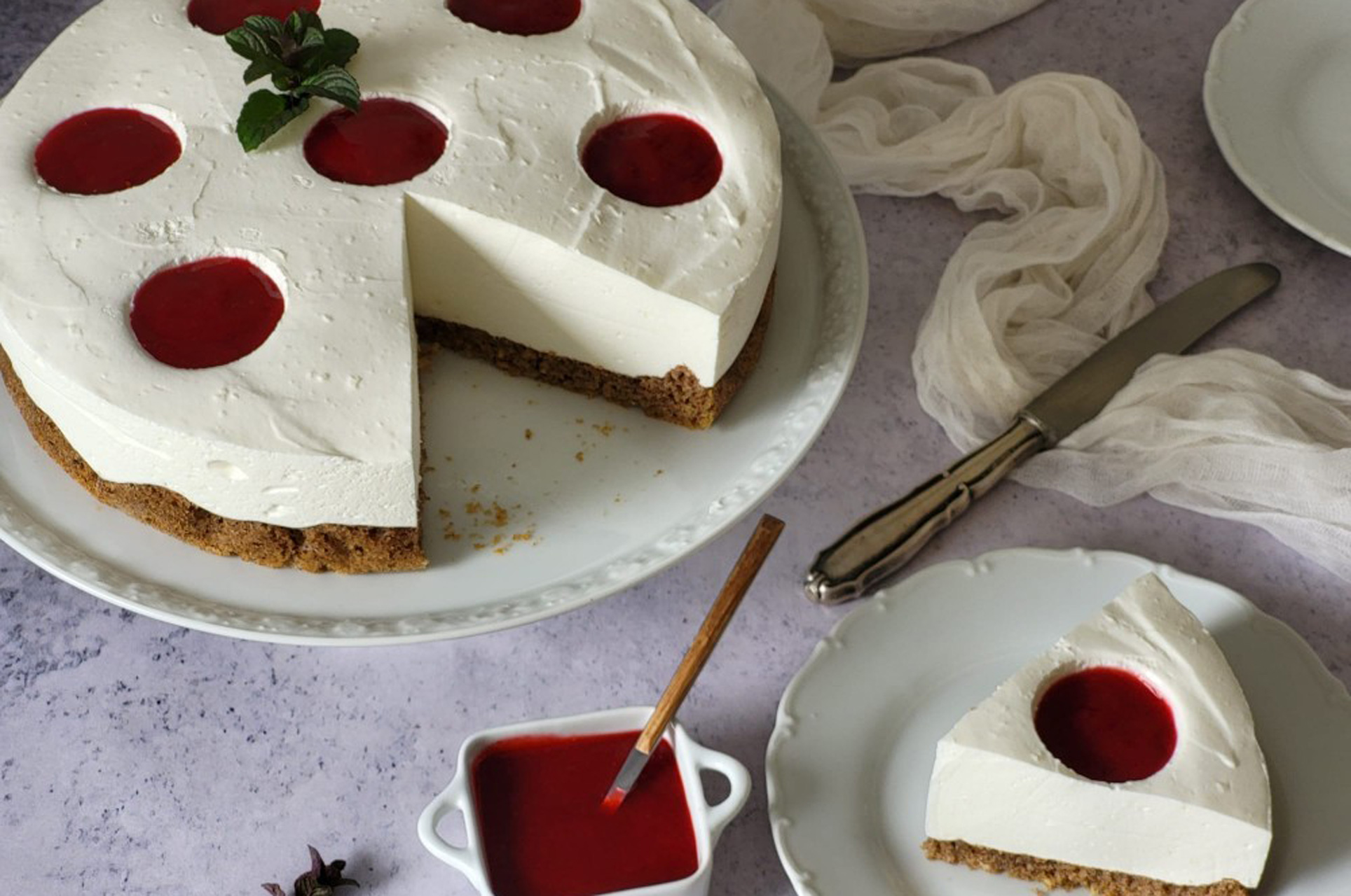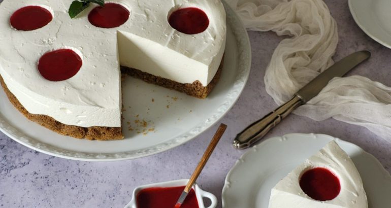 Preljev od malina ulijte u udubljenja od čašica koja ste napravili na torti i uživajte u ovom ukusnom desertu.