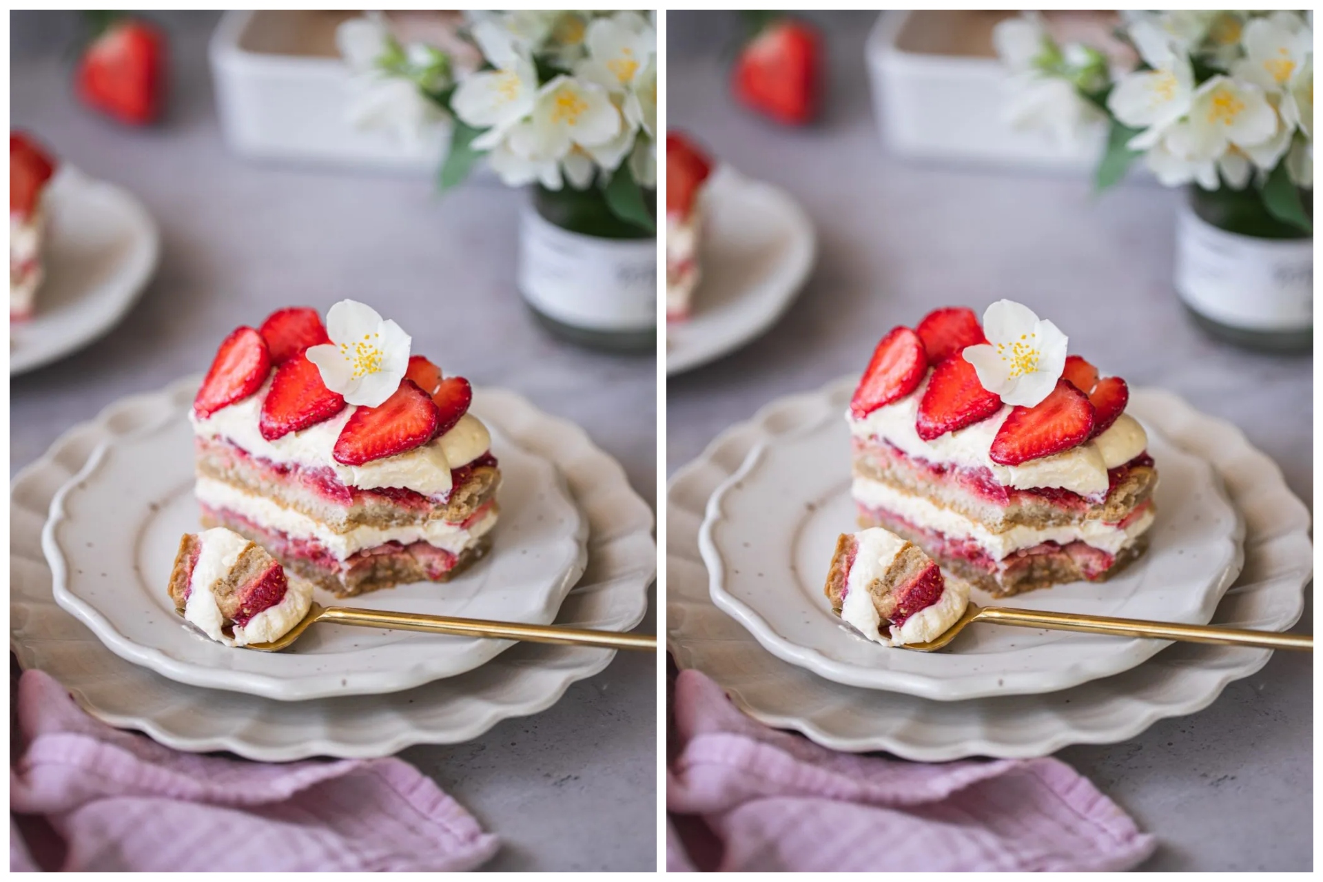 Izvadite kremu iz hladnjaka i prebacite je u slastičarsku vrećicu koristeći nastavak po želji. Rasporedite kremu preko jagoda. Na kremu ponovno poslažite namočene piškote, ostatak jagoda i završite kremom. Prebacite tiramisu u hladnjak i ostavite da se hladi minimalno 6 sati, najbolje preko noći.