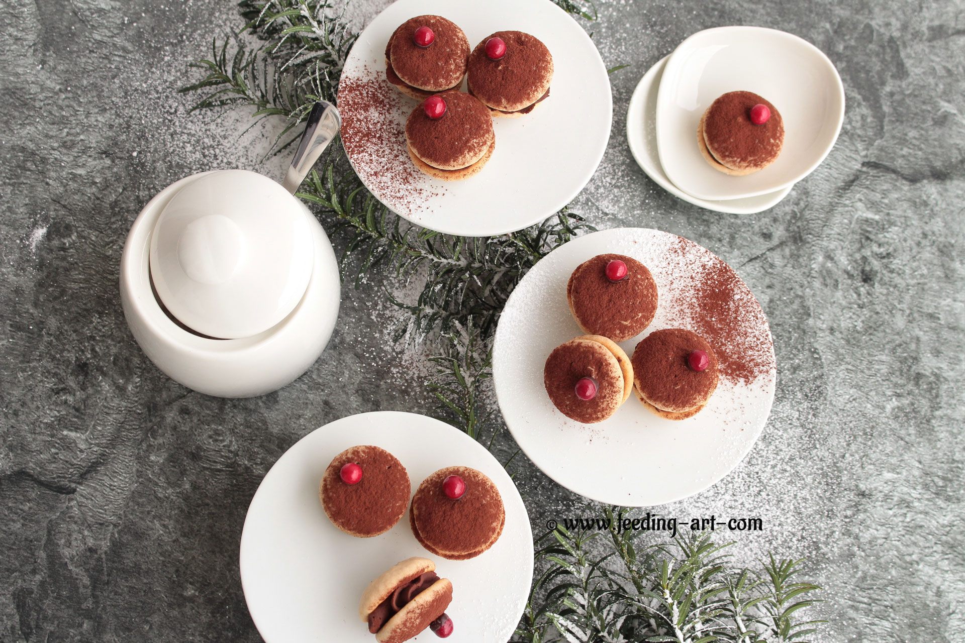 Za dekoraciju otopiti čokoladu na pari. Prebaciti je u slastičarsku vrećicu i odsjeći vrh vrećice. Keksiće posuti kakaom, na svaki keksić istisnuti malo čokolade i perlicama dekorirati.