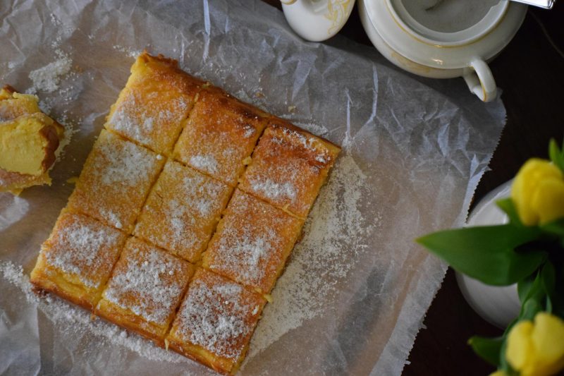 Gotovi kolač izvadite iz pećnice te ga ostavite da se skroz ohladi u limu za pečenje. Ohlađeni kolač izvadite iz lima za pečenje, izrežite na jednake komade, po želji pospite šećerom u prahu i poslužite.