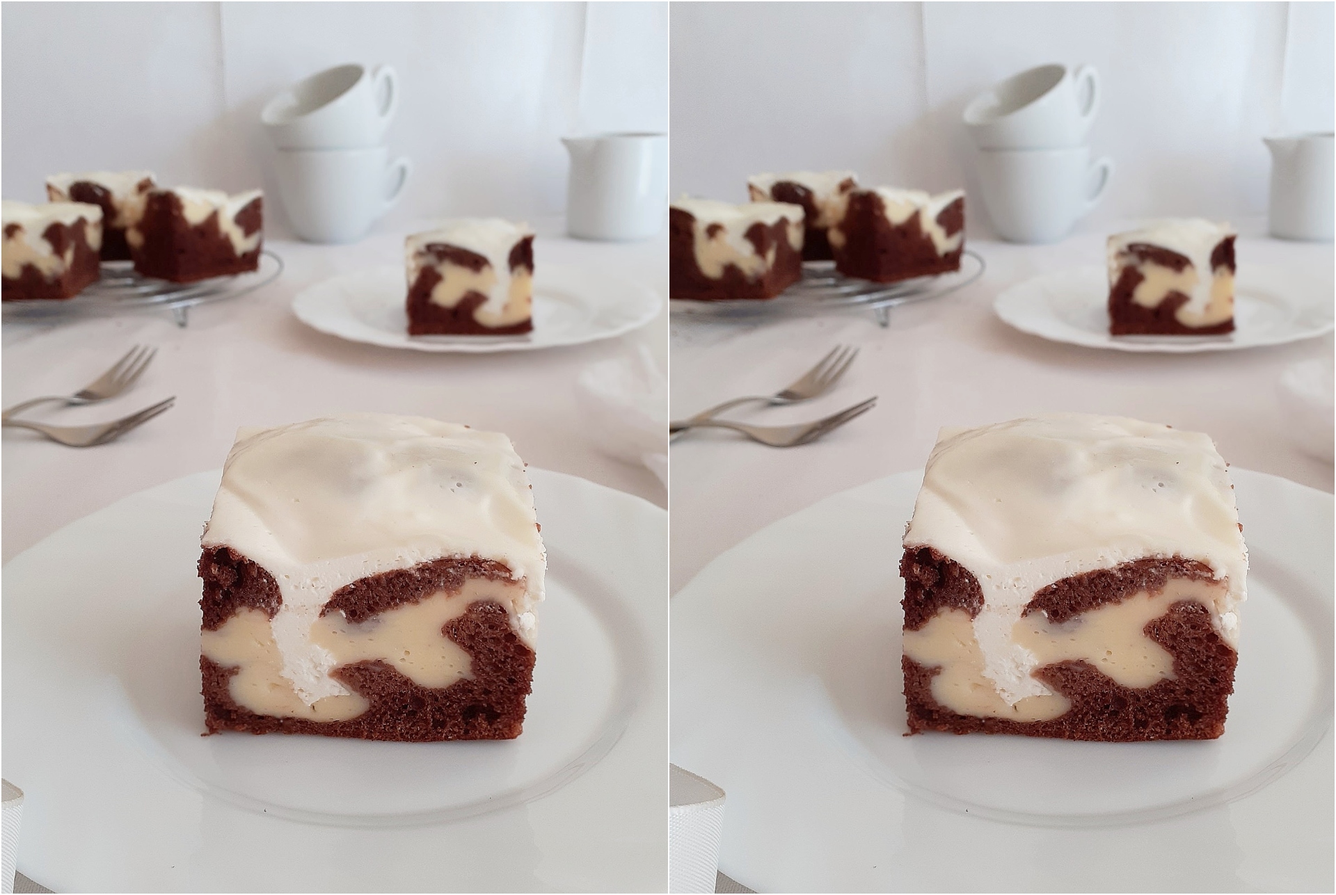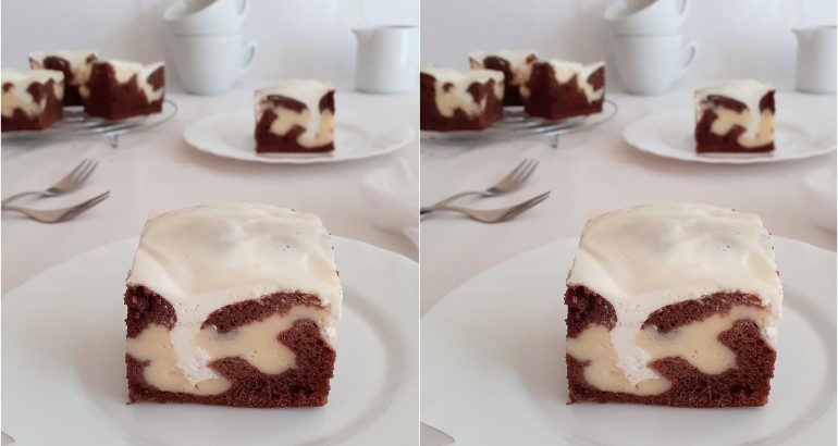 Lim za pečenje nauljite i pobrašnite te ulijte pripremljenu smjesu na biskvit. Zatim, pomoću dvije žličice ravnomjerno rasporedite hrpice pudinga od vanilije te stavite peći na 180°C cca 40 minuta.