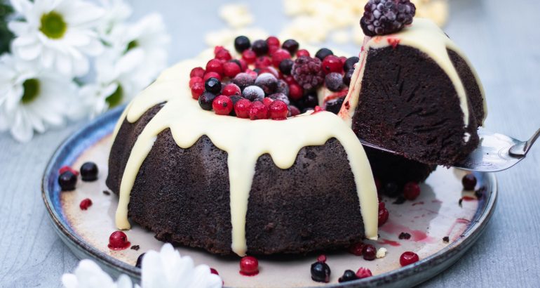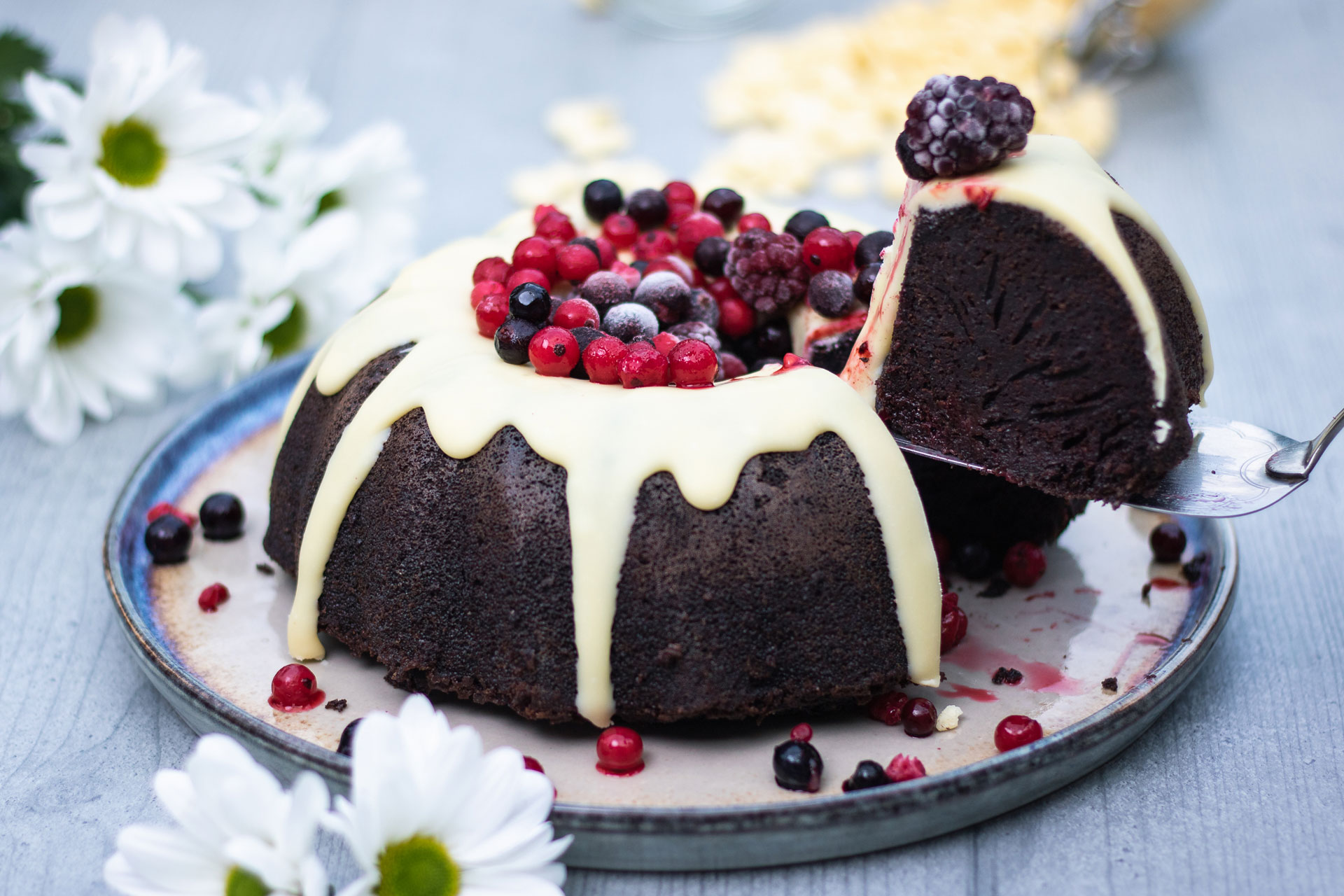 Pomoću žlice preljev premažite preko kuglofa, po želji dodajte bijele čokolade i šumskog voća i poslužite uz omiljeno vino.