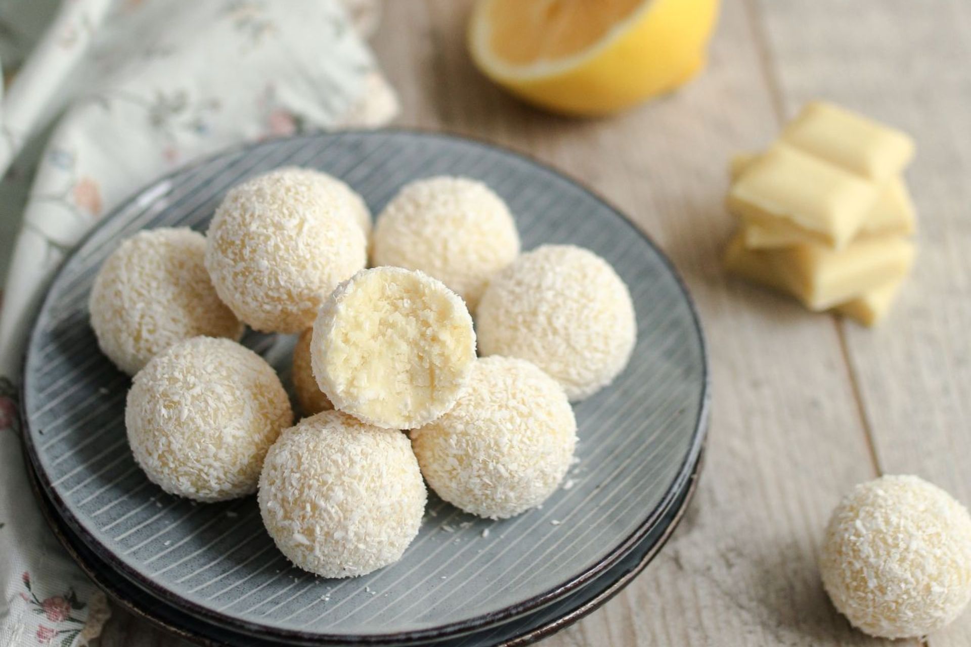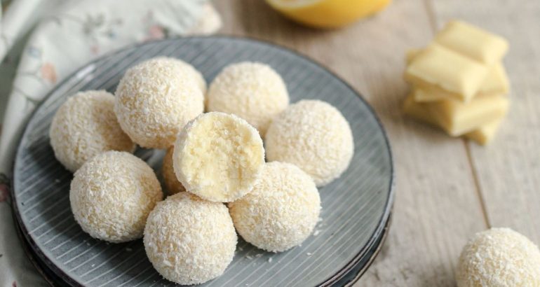 Zagrijte slatko vrhnje do vrenja, skinite s vatre i prelijte preko bijele čokolade izlomljene na kocke. Neka odstoji tako minutu pa pjenjačom miješajte dok se sva čokolada ne otopi. Dodajte naribanu koricu limuna i žlicu soka od limuna i promiješajte. Na kraju dodajte i kokos i sve sjedinite.