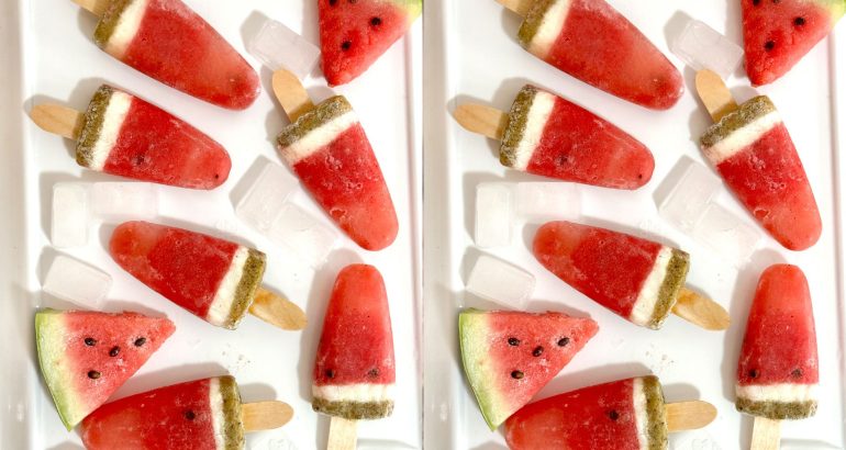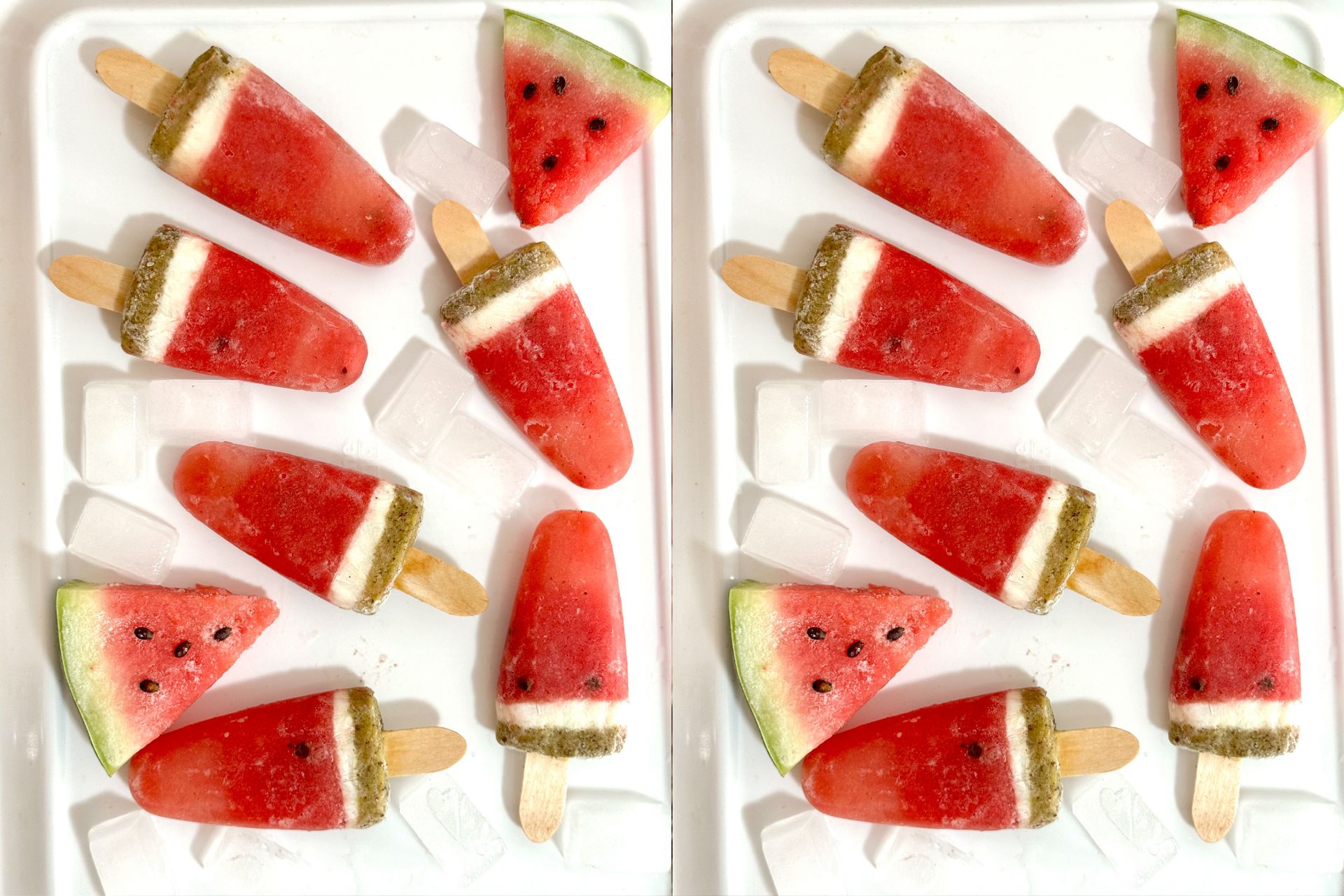 Izblendajte 2 čaše lubenice (bez koštica) s limunovim sokom i šećerom po želji. Ulijte u kalupe za sladoled, do pola, utisnite štapiće, pobacajte kapljice čokolade, malo utisnite čačkalicom i stavite u zamrzivač da se zaledi.
