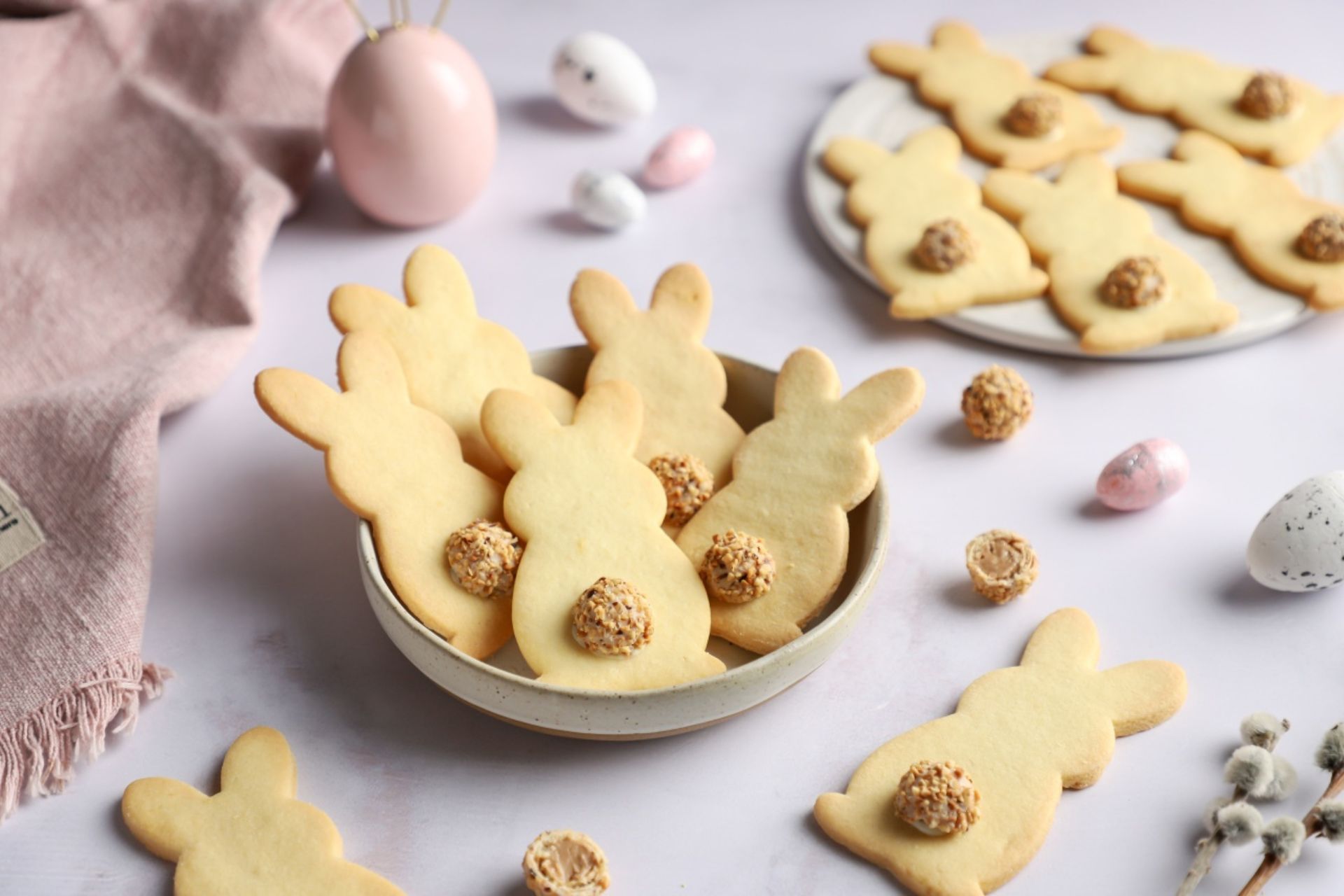 U mikrovalnoj otopite malo bijele čokolade, prebacite je u vrećicu kojoj ste odrezali vrh pa stavljajte po malo otopljene čokolade na svaki keks i zalijepite polovinu kuglice, tako da izgleda zecu kao rep. Pladanj s keksima možete prebaciti nakratko u hladnjak, 5 – 10 minuta da se čokolada prije stisne.