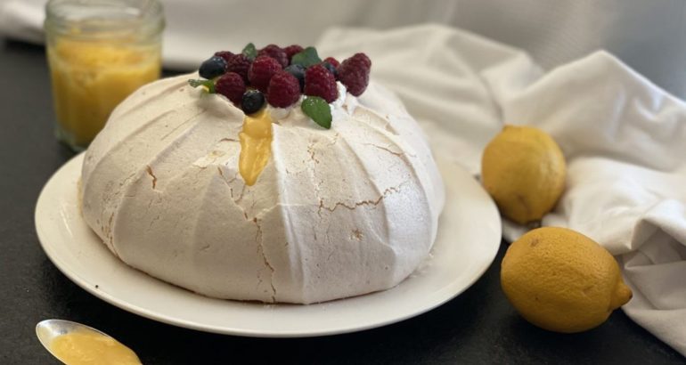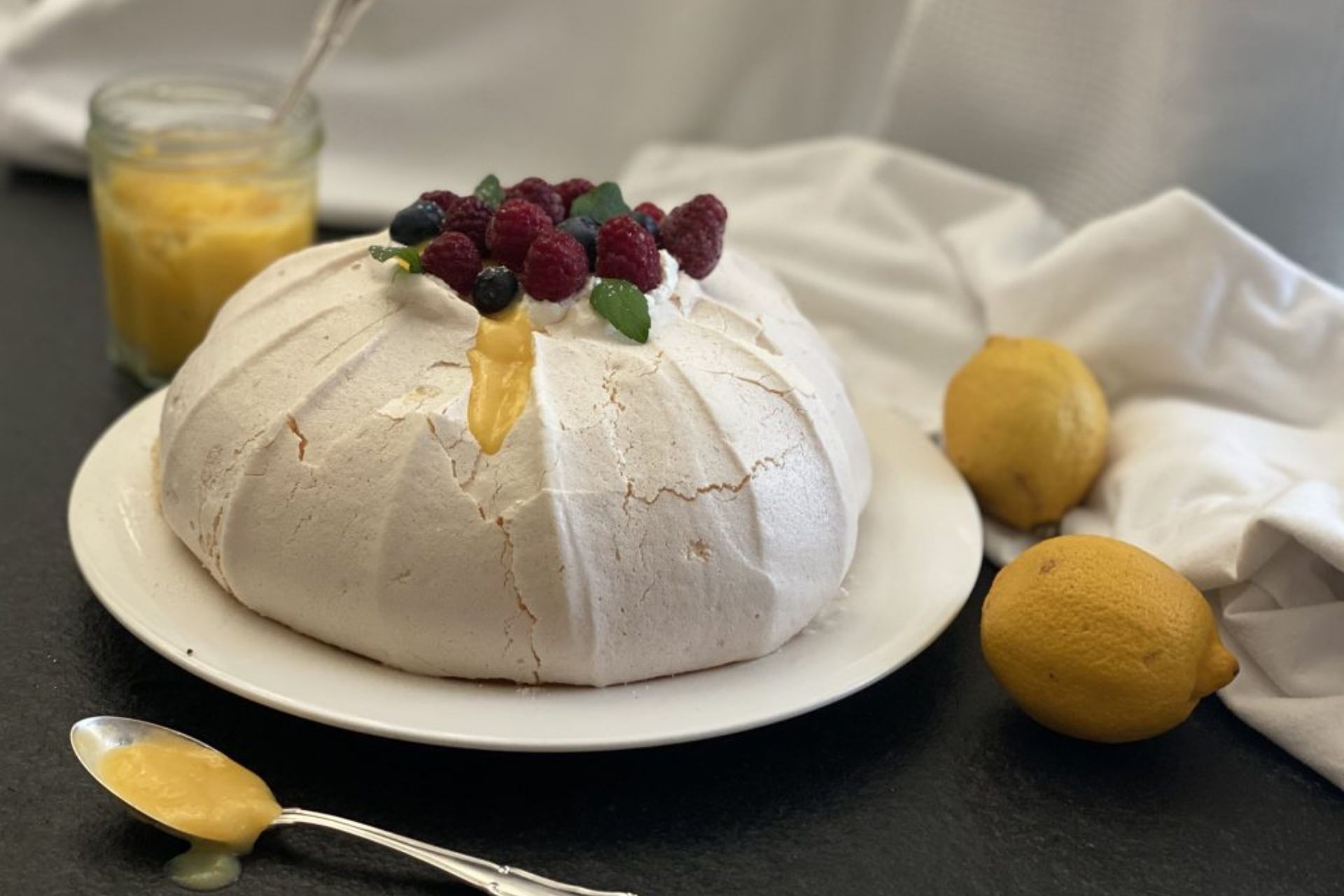 Koru za Pavlovu prebacite na tanjur za posluživanje, pažljivo napravite udubinu na vrhu kore te je napunite diplomat kremom, a preko toga stavite lemon curd pa pospite bobičastim voćem po želji.