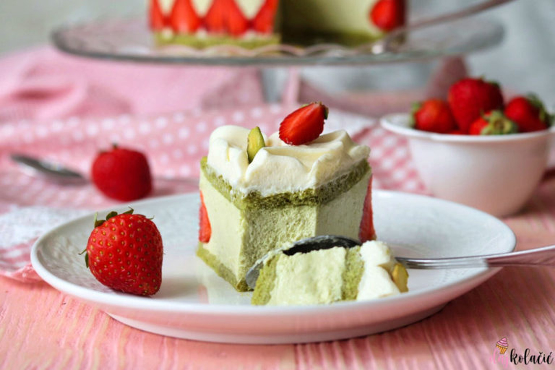 S bloga Daj kolačić autorice Lorene Mihelčić na naš portal stiže recept za tortu od pistacija i jagoda. Recept je za mali kalup pa autorica savjetuje da odmah poduplate sastojke.