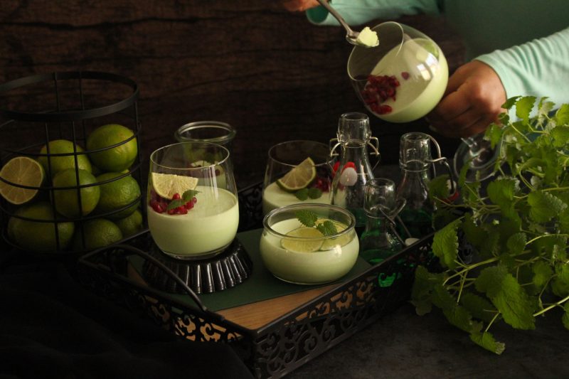 Preostalu količinu slatkog vrhnja izmiksati, ali ne predugo, nego u laganu kremu te umiješati u prvu polovicu kreme za panna cottu. Prirodna boja deserta je nježno zelena, ja sam je malo intenzivirala zelenom prehrambenom bojom radi optičkog efekta, inače nije potrebno, aroma ostaje ista.
