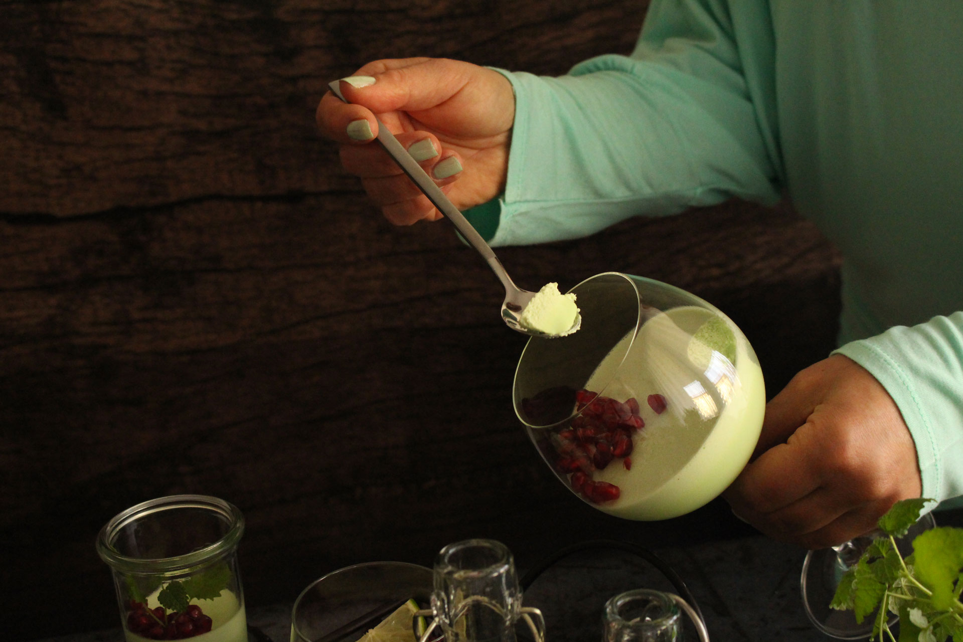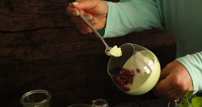 Preostalu količinu slatkog vrhnja izmiksati, ali ne predugo, nego u laganu kremu te umiješati u prvu polovicu kreme za panna cottu. Prirodna boja deserta je nježno zelena, ja sam je malo intenzivirala zelenom prehrambenom bojom radi optičkog efekta, inače nije potrebno, aroma ostaje ista.
