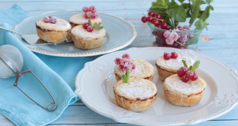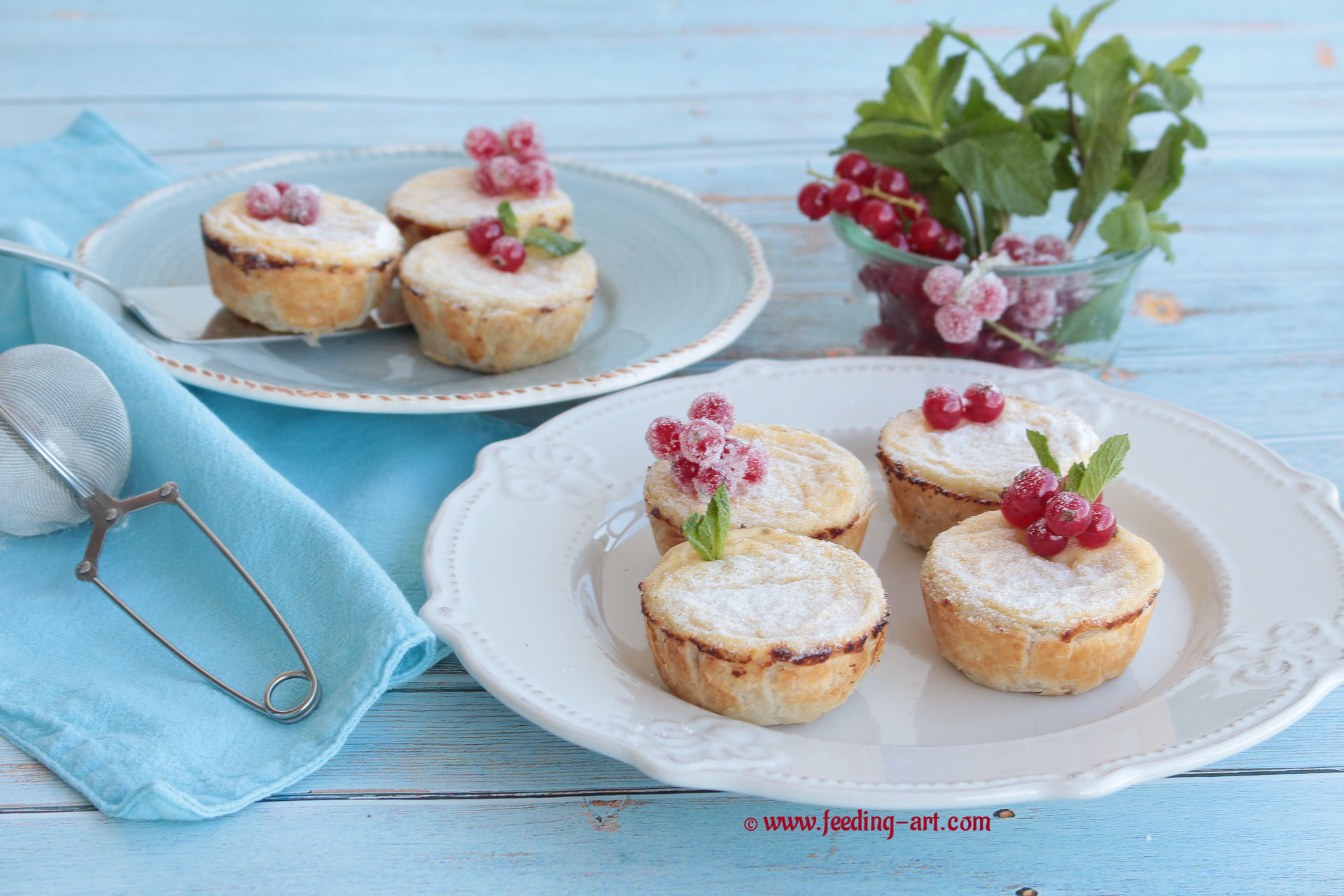 Zagrijati pećnicu na 220°C. Svaku košaricu od muffin pleha dobro premazati maslacem. Od lisnatog tijesta, okruglim obručem ( ᴓ 9cm ) izrezati 12 krugova. Krugove od lisnatog tijesta položiti u košarice oko 1 cm ispod ruba košarice. Vilicom izbosti dno od tijesta. Izliti puding masu u košarice tako da masa bude nešto iznad ruba tijesta. Tortice peći oko 12 minuta. Ostaviti da se ohlade. Po želji posuti šećerom u prahu i ukrasiti ribizlama.