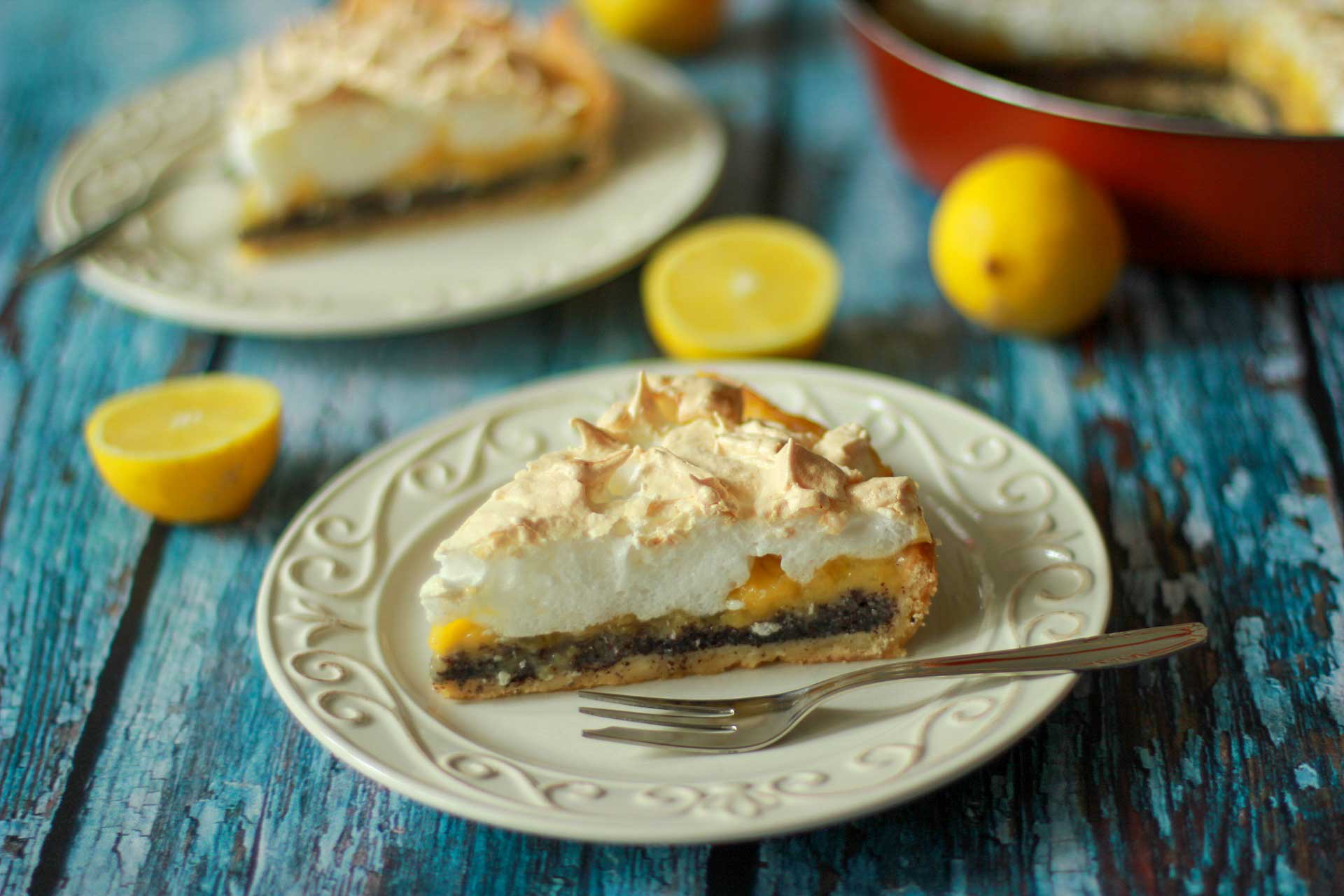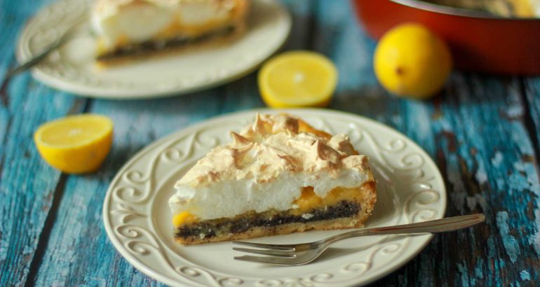 Tijesto izvadite iz pećnice, maknite kuglice za pečenje i papir za pečenje. Po tijestu najprije ravnomjerno rasporedite sloj maka, zatim izlijte lemon curd i na kraju stavite meringu. Meringu stavite na ohlađenu kremu od limuna, ne na vruću. Stavite sve zajedno peći još petnestak minuta u pećnicu zagrijanu na 150 stupnjeva, dok meringa malo ne potamni.