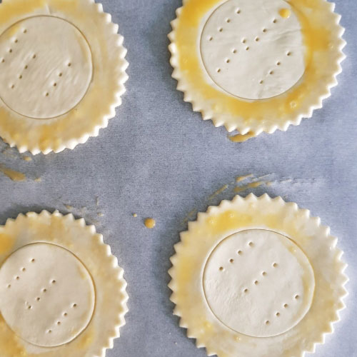 Koristila sam listove već razvaljanog lisnatog tijesta koje sam izrezala okruglim kalupom, pritisnula još jednu unutarnju kružnicu sa čašom, ali ne do kraja i rubove premazala jajetom.