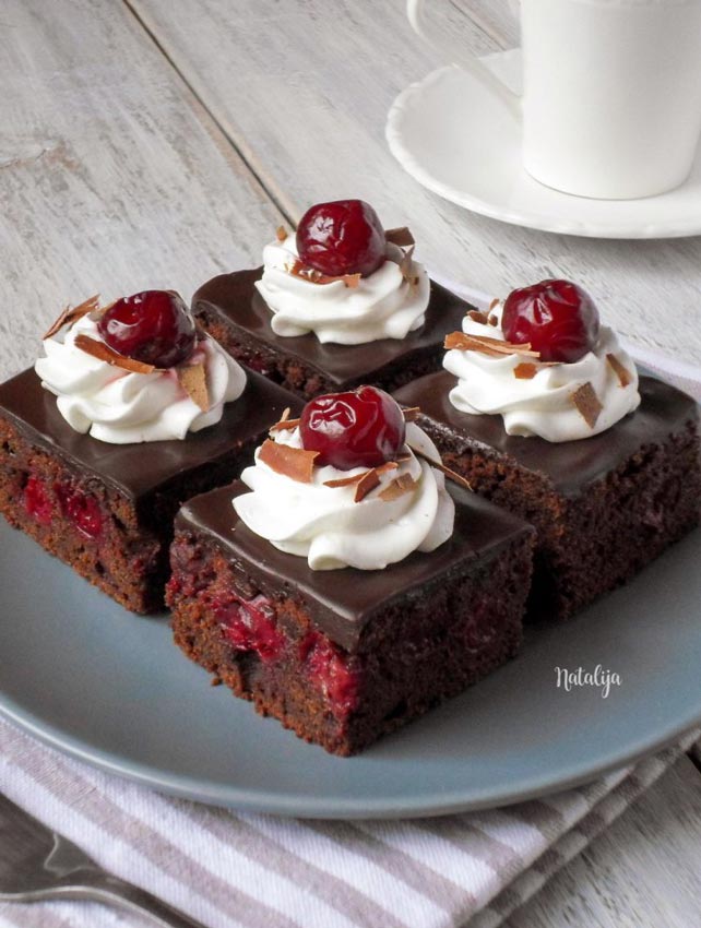 Umutite slatko vrhnje i dekorirajte svaku kocku kolača uz pomoć slastičarske vreće za dekoriranje te stavite po jednu višnju na šlag i po želji izribanu ili struganu čokoladu. Ja sam napravila strugotine pomoću noža.