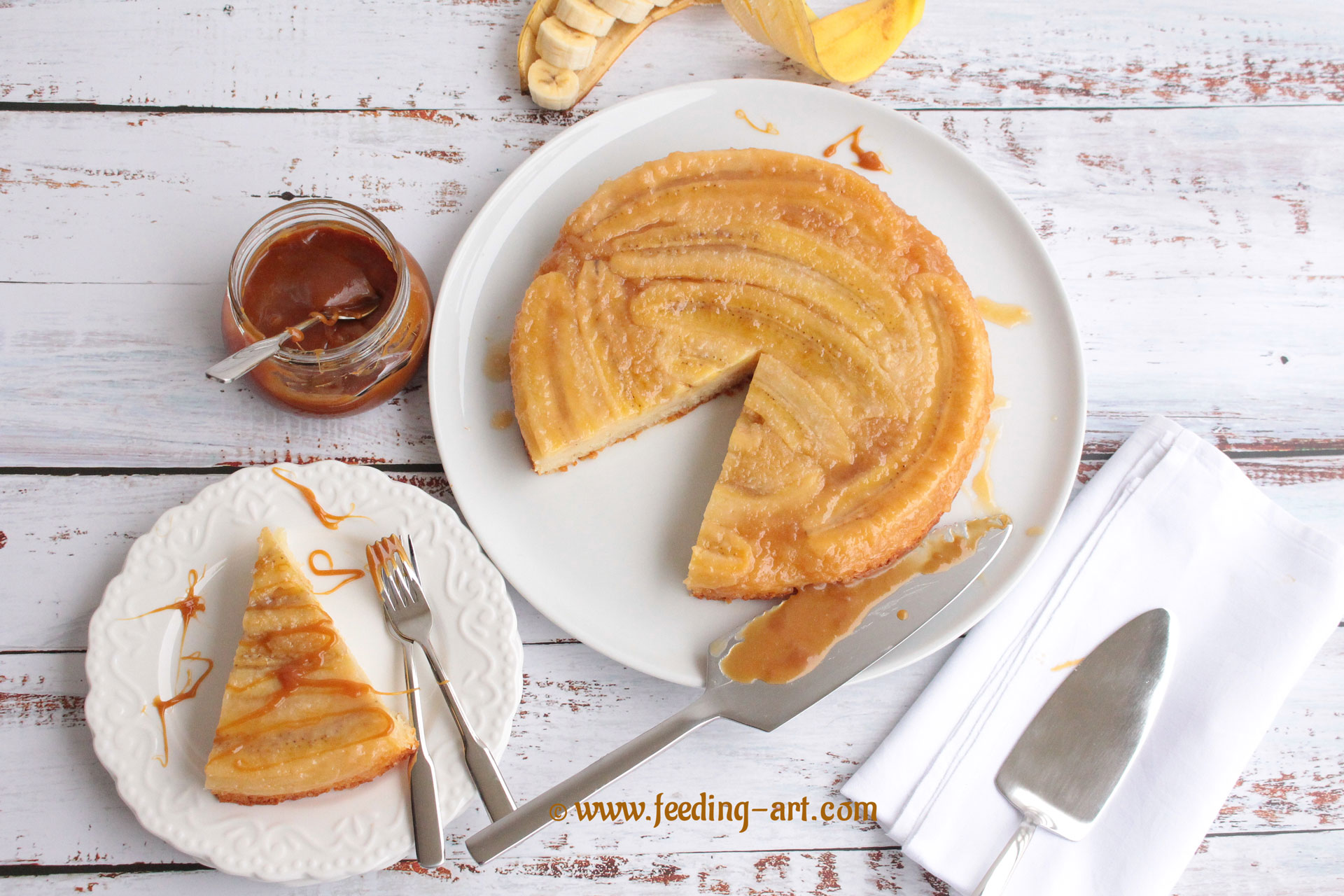 Kolač ostaviti da se malo ohladi te odstraniti obruč. Kad se potpuno ohladi okrenuti ga na tanjur tako da su banane na vrhu kolača. Po želji se kolač može servirati sa slanim karamel umakom.