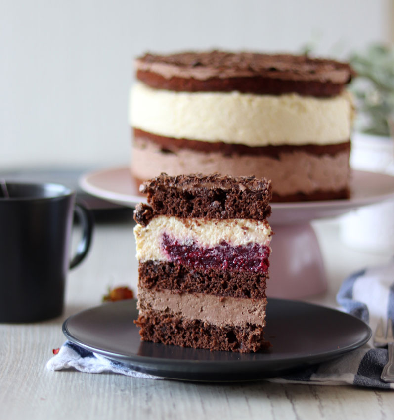 Tortu slažite u kalupu. Prvo stavite biskvit, pa kremu od čokolade (2-3 žlice kreme ostavite sa strane pa ćete njome premazati zadnju koru na kraju). Poklopite drugom korom. Kremom od vanilije napravite rub po biskvitu, pa u sredinu stavite insert od malina. Sada pažljivo preko njega stavite ostatak kreme od vanilije. Poklopite sa zadnjom korom te je premažite čokoladnom kremom (one 2-3 žlice koje ste ostavili sa strane). Po želji naribajte po vrhu čokoladu.