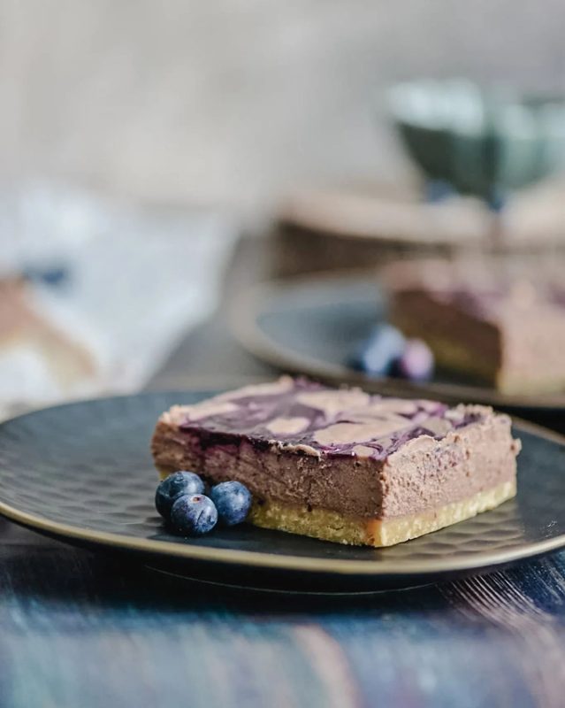 Na kremu rasporedite kremu od borovnica u par hrpica, štapićem ili nožem prošarajte po kolaču. Ostatak kreme od borovnica poslužite prilikom serviranja!