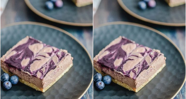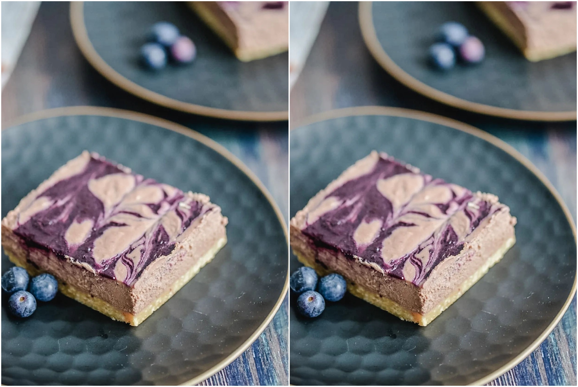 Na kremu rasporedite kremu od borovnica u par hrpica, štapićem ili nožem prošarajte po kolaču. Ostatak kreme od borovnica poslužite prilikom serviranja!