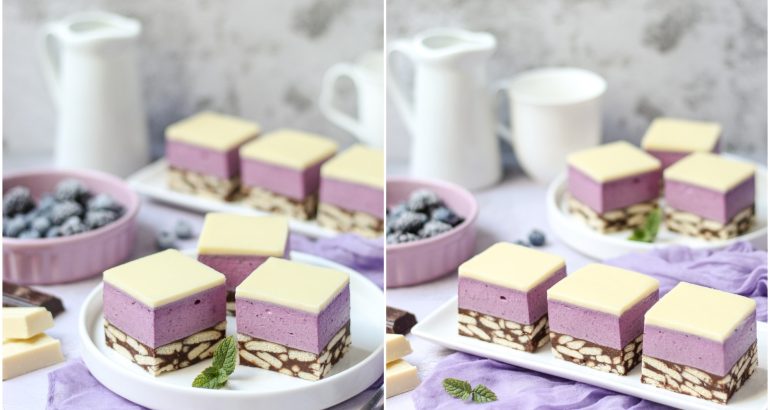 Prelijte ganache preko ohlađene ljubičaste kreme i poravnajte. Kolač stavite u hladnjak na nekoliko sati, a najbolje preko noći, da se dobro ohladi i stegne. Potom režite na kocke i uživajte!