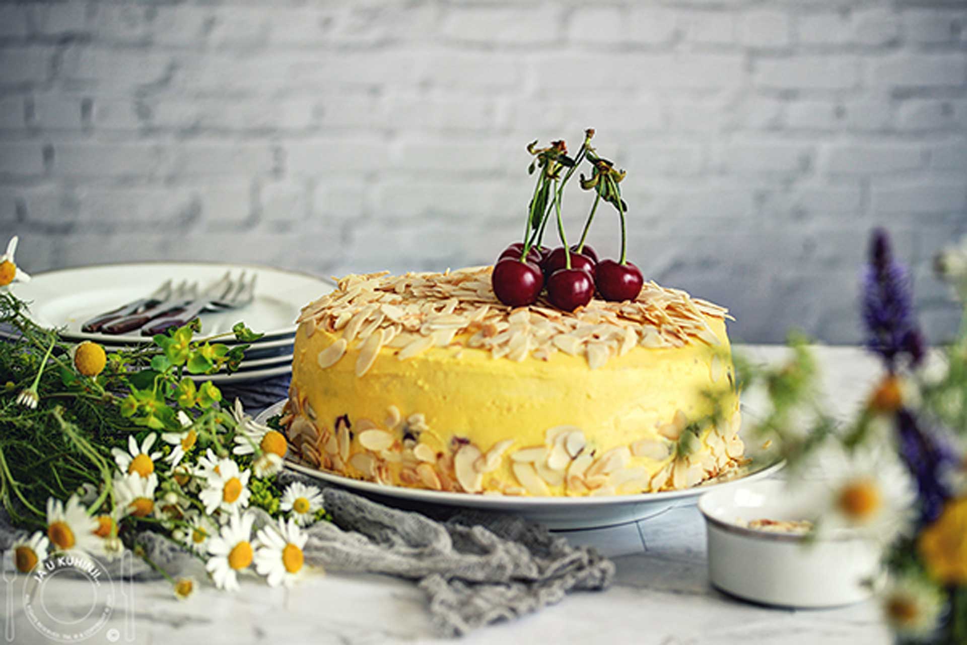 Tortu zatim dobro rashladite, a pred serviranje cijelu pospite pečenim bademima i servirajte s pokojom svježom višnjom.