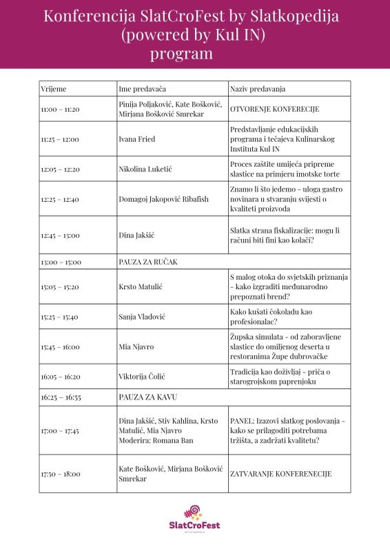 Nakon više mjeseci predanog rada na osmišljavanju programa naše druge konferencije SlatCroFest by Slatkopedija (powered by Kul IN), konačno vam donosimo sve detalje i predavanja koja će vas zasigurno oduševiti.